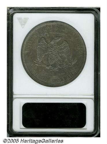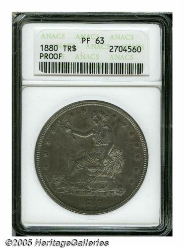 <B>1880<T$1> PR63 ANACS.</B></I> Moderately hairlined beneath a layer of mottled, dusky-gray, green, and crimson color as the coin is turned under a light. This proof-only coin retains most of its original brilliance that has no problem shining through the toning. Some cameo contrast is noted.