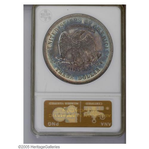 <B>1880<T$1> PR63 ANACS.</B></I> Well struck and nicely preserved, with a deep layer of original toning over both obverse and reverse. Rich violet-brown and sea-green are the dominant colors. No contact marks seem evident, but there are a few wispy hairlines on each side of the piece. Only 1,987 pieces were struck of the 1880 Trade dollar, all of which were proofs.