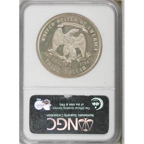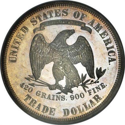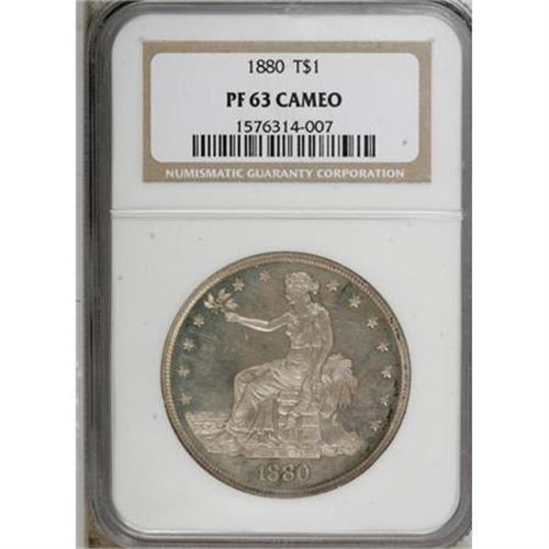 <B>1880 T$1 PR63 Cameo NGC.</B></I> With a mintage that falls just shy of 2,000 pieces, the 1880 has the highest mintage of any proof Trade dollar issue, and type collectors frequently choose the date for their cabinets. Lemon-gold and sky-blue shadings drape the otherwise silver-gray surfaces of this gleaming and heavily contrasted Select specimen. Light hairlines in the fields preclude a finer designation.<BR><BR><b>Shipping:</b> Coins & Currency (<a target="_blank" href="http://www.heritageauctions.com/common/shipping.php">view shipping information</a>)