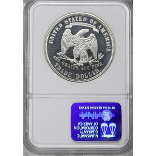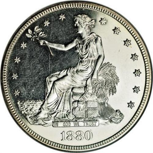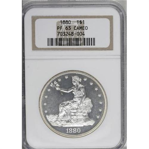 <B>1880 T$1 PR63 Cameo NGC.</B></I> The Trade dollar was made essentially useless by the Morgan dollar that superseded it beginning in 1878, and accordingly the emissions from 1879 through the series end were proof-only. Of those, the 1880 issue was the high-water mark in terms of numbers struck, at 1,979 pieces. This example displays a ring of light gold around beautiful, untoned, silver-white centers, with a bold strike and only a few scattered small contact marks. A nice coin for the grade.<BR><BR><b>Shipping:</b> Coins & Currency (<a target="_blank" href="http://www.heritageauctions.com/common/shipping.php">view shipping information</a>)