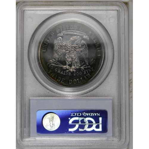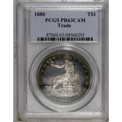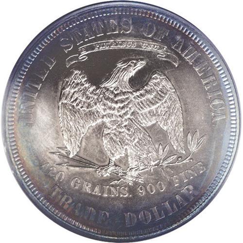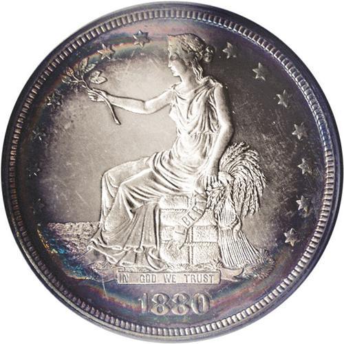 <B>1880<T$1> PR63 Cameo PCGS.</B></I> Concentric rainbow rings of pastel lilac toning in the center spread to embrace magenta, lemon-yellow, jade-green, and russet on this lovely Trade dollar. The piece is well struck overall, but a bit of bluntness shows on Liberty's head. The frosty devices provide good contrast with the brilliant fields. Perusal with a loupe reveals a pinscratch through NITED, but the eye appeal is considerable.