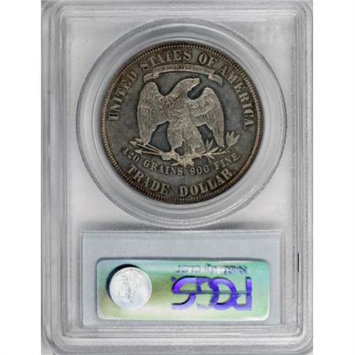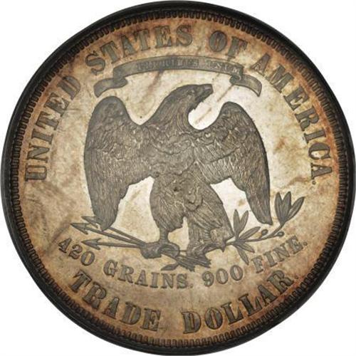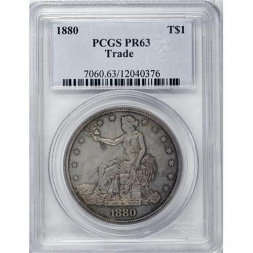 <B>1880 T$1 PR63 PCGS.</B></I> The Trade dollar series was winding down, and this was a proof-only issue of just 1,987 pieces. This piece is crisply struck and all of the central design elements are well defined, while the peripheral devices on the obverse remain a trifle weak, including the stars and Liberty's hair detail. Mottled coral-red and gold toning is most noticeable on the design's highpoints, while the fields exhibit faint greenish coloration. A few minor handling marks and wispy hairlines limit the grade of this Select proof specimen. <BR><BR><B>Coin Engraver:</B> William Barber<BR><BR><b>Shipping:</b> Coins & Currency (<a target="_blank" href="http://www.heritageauctions.com/common/shipping.php">view shipping information</a>)