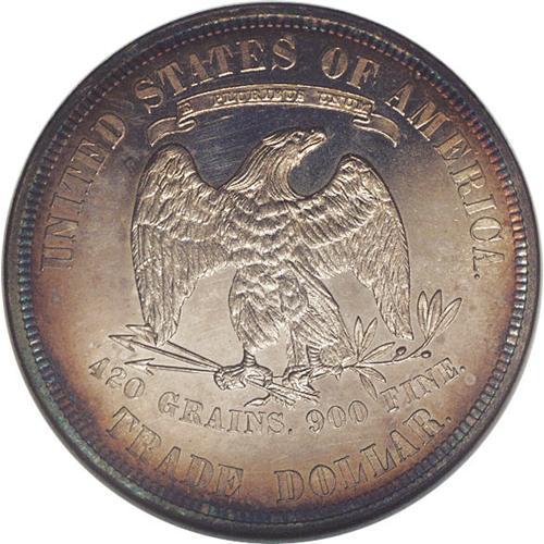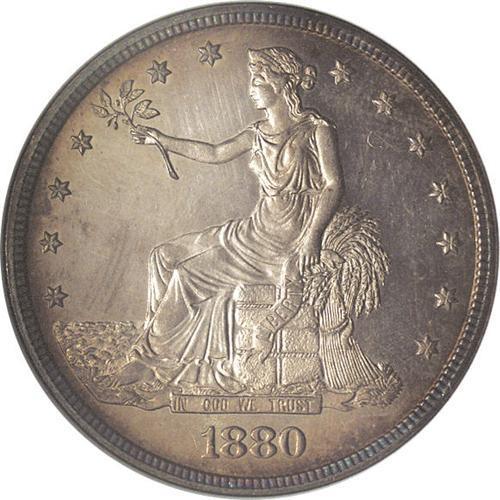 <B>1880<T$1> PR64 Cameo NGC.</B></I> Well mirrored and contrasted surfaces are draped in smoky gray patina, with deeper orange and blue peripheral accents. A few trivial disturbances are noted in the obverse fields and a curly fragment is situated to the right of Liberty's shoulder. Census: 31 in 64, 63 finer (4/06).