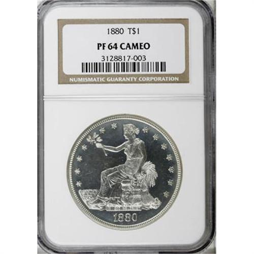 <B>1880 T$1 PR64 Cameo NGC.</B></I> Despite a thin veil of silver-gray patina that graces the fields, this attractive Choice piece offers exemplary contrast between the undimmed mirrors and the richly frosted silver-white devices. A handful of light hairlines in the fields account for the grade. This proof-only issue, the second for the series, has the highest mintage of any proof Trade dollar and is popular with type and date collectors alike.<BR><BR><b>Shipping:</b> Coins & Currency (<a target="_blank" href="http://www.heritageauctions.com/common/shipping.php">view shipping information</a>)