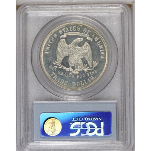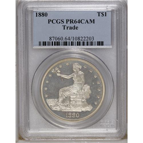 <B>1880 T$1 PR64 Cameo PCGS.</B></I> Frosty motifs are highlighted by the deep mirror fields, and the design elements are emboldened by a powerful strike. Nearly untoned surfaces display just the slightest hint of occasional light tan color. A few wispy handling marks account for the grade. While many 1880 proof Trade dollars have survived, those with the Cameo label are more elusive. Population: 33 in 64 Cameo, 27 finer (10/06).<BR><BR><b>Shipping:</b> Coin/Currency (<a target="_blank" href="http://www.heritageauctions.com/common/shipping.php">view shipping information</a>)