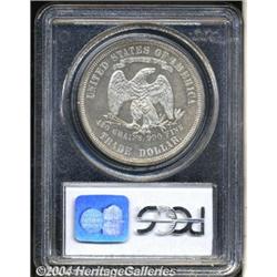 <B>1880<T$1> PR64 Cameo PCGS.</B></I> Deep-golden tinged about the obverse border, both the obverse and reverse show a nearly blemish-free appearance. Above average striking definition and silky-smooth features help to provide expectantly solid eye appeal for a late date proof Trade Dollar at the near-Gem level of preservation. The appreciably frosted devices appear to float atop glassy reflectivity in the fields.<BR><I>Ex: A.N.A., A. Kosoff, Numismatic Ent. Sale (8/68), lot 403, where it realized $290.</B></I> <BR><BR><B>Important notice:</B> Heritage usually auctions material at the rate of 200-250 lots per hour. On some occasions eBay Live bid software or the Internet may not be able to keep up with the pace of the auction. We recommend placing a realistic absentee bid now as insurance to avoid disappointment. Occasionally the auctioneer may eliminate or reject an eBay Live bid, and the auctioneer may also reopen a lot after the close of the eBay live bidding (usually because we missed an audience bid), and may reject your bid even if it shows you as the winning bidder. By bidding via eBay Live, you agree that Heritage may award the lot to another bidder at its sole discretion under the circumstances described above or any other reasonable circumstances. Since eBay bids are not shown to us until we open the lot on the floor, we treat those bids just like floor bids. In most cases the floor responds before the eBay bid is presented to us, due to Internet lag time, so for consistency we have made it a policy that floor bids are always considered first over tie eBay live bids. Also please note that all Heritage lots purchased through eBay Live carry a 20% Buyer's Premium. Please make sure you read the Terms and Conditions before you bid.