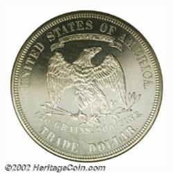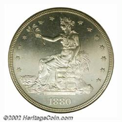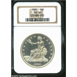 1880 T$1 PR64 NGC. The Philadelphia Mint's delivery of 1,987 coins in 1880 set a record for the proof Trade Dollar series. On the other hand, the government did not issue any business strikes of this date, with the result that the 1880 is among the more popular dates with advanced specialists. Powerfully impressed throughout, this coin is mostly brilliant in finish with deep reflectivity in the fields. Nevertheless, there are some suggestions of mint frost over the central devices, particularly on the reverse. The minimally patinated surfaces are smooth with only a few wispy hairlines barring the way to a full Gem grade. Important notice: We expect to be auctioning lots at the rate of 200-250 per hour. Sometimes eBay Premier live bid software cannot keep up with that pace, so we strongly recommend that you place a realistic proxy bid now as insurance to avoid disappointment. Also please note that all Heritage/CAA lots purchased through eBay Premier carry a 20% Buyer's Premium. Please make sure you read the Terms and Conditions.