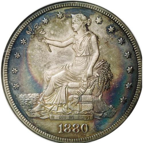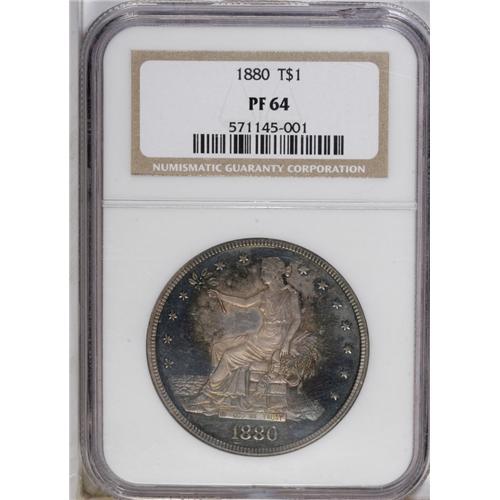 <B>1880<T$1> PR64 NGC.</B></I> The deeply mirrored surfaces are richly toned in variegated iridescent hues and reveal a bit of isolated softness on Liberty's head and surrounding stars. A desirable proof-only issue with a mintage of only 1,987 specimens.