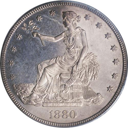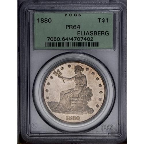 <B>1880<T$1> PR64 PCGS.</B></I> Ex: Eliasberg. Dusky chestnut toning graces the obverse. The reverse is slightly darker, and the tan hues blend with hints of navy-blue iridescence. This well struck proof-only piece has a well preserved reverse, while the obverse field displays faint hairlines. In a green label holder. An opportunity to begin the reunification of the Eliasberg collection.<BR><I>Ex: Ganert Collection; Edouard Frossard; J.M. Clapp, 5/1896; John H. Clapp; Louis E. Eliasberg, Sr. Collection (Bowers and Merena, 4/97), lot 2349.</B></I>