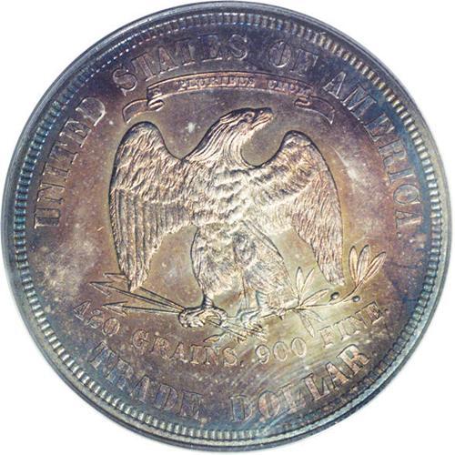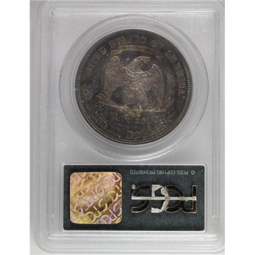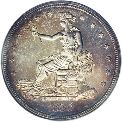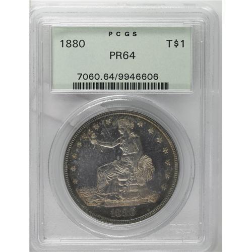 <B>1880 T$1 PR64 PCGS.</B></I> This near-Gem proof Trade dollar exhibits a cameo-like effect, that imparts wonderful eye appeal to the coin. This appeal is further enhanced by the powerful strike imparted to the design features. Golden-gray patina in the centers yields to slivers of cobalt-blue and lavender at the margins. A large number of the 1,987-piece mintage of this proof-only issue still exist.<BR><BR><b>Shipping:</b> Coin/Currency (<a target="_blank" href="http://www.heritageauctions.com/common/shipping.php">view shipping information</a>)