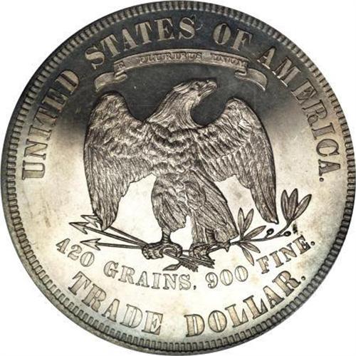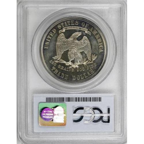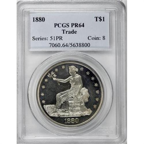 <B>1880 T$1 PR64 PCGS.</B></I> The 1880 is a proof-only issue with a mintage of 1,987 pieces, the highest in the Trade dollar series. A light coat of golden-tan and powder blue color rests on flashy surfaces. The design elements are virtually complete, which is unusual for the date where the upper stars and Liberty's head are normally weak. Well preserved throughout.<BR><BR><B>Coin Engraver:</B> William Barber<BR><BR><b>Shipping:</b> Coins & Currency (<a target="_blank" href="http://www.heritageauctions.com/common/shipping.php">view shipping information</a>)
