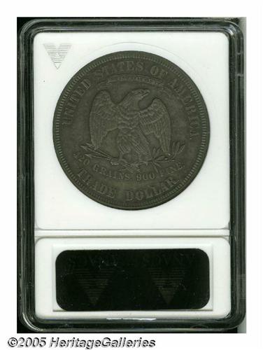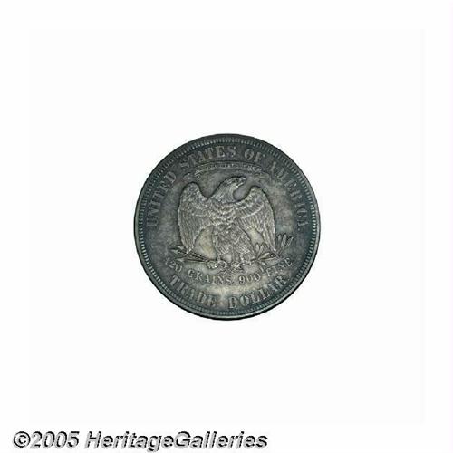 <B>1880<T$1> PR65 ANACS.</B></I> For the third year in a row, the Philadelphia Mint produced Trade Dollars solely in proof format in 1880. This is perhaps the most common date from the end of this short-lived series, but high quality survivors are rare when compared to the number of advanced collectors in today's hobby. This coin is sharply impressed on both the obverse and reverse. Deeply toned in finish with blue-gray toning overall, and essentially distraction-free surfaces. Remnants of a fingerprint are seen above Liberty's extended arm.