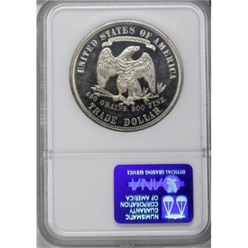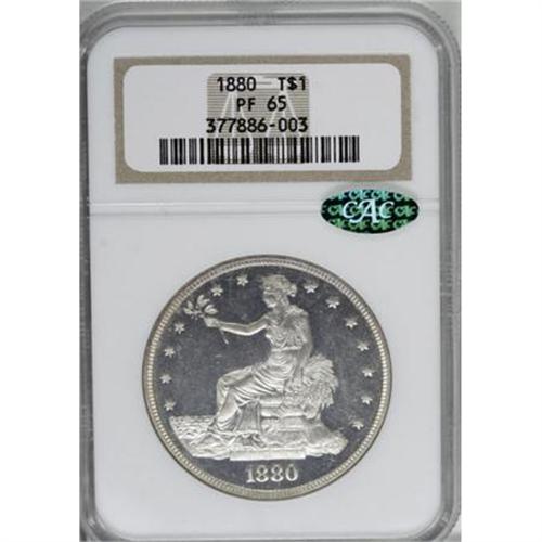 <B>1880 T$1 PR65 NGC. CAC.</B></I> The surfaces appear to merit a Cameo designation, even though it is absent from the encapsulation. Much silver-on-black contrast is present, however, with barely a hint of discernible gold color. The fields are well mirrored, and thick mint frost drapes the devices. Scant evidence of contact, mostly visible under a loupe, prevents a higher grade, but this Gem proof has much appeal. <BR><I>From The Southwest Collection.</B></I><BR><BR><B>Coin Engraver:</B> William Barber<BR><BR><b>Shipping:</b> Coins & Currency (<a target="_blank" href="http://www.heritageauctions.com/common/shipping.php">view shipping information</a>)