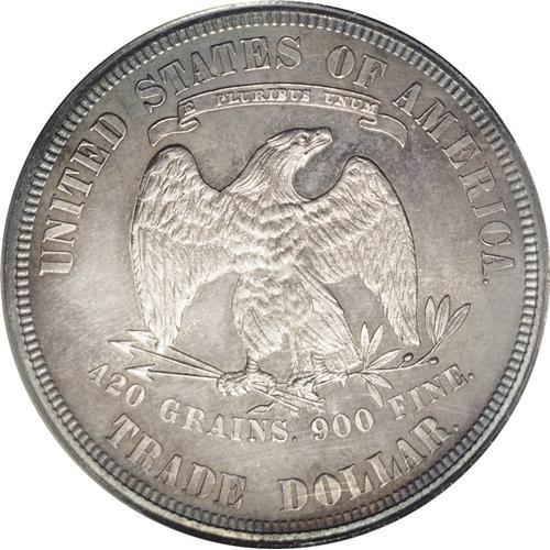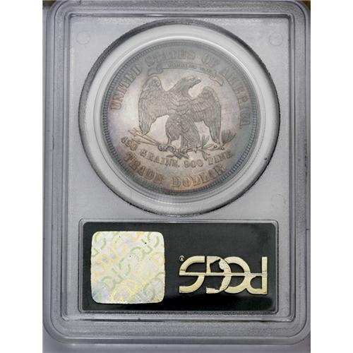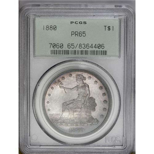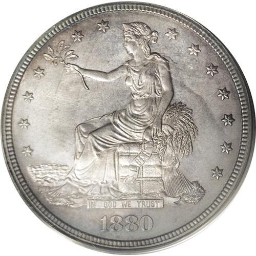 <B>1880<T$1> PR65 PCGS.</B></I> Blended cream-gray and plum toning is bordered by deeper apple-green and mauve coloration. The strike is exquisite, with complete detail on the eagle's claws, and on the stars near Liberty's head. Light die doubling is present on the bases of the letters in 420 GRAINS, as usual for this popular proof-only variety. Housed in an older green label holder.