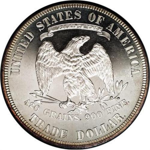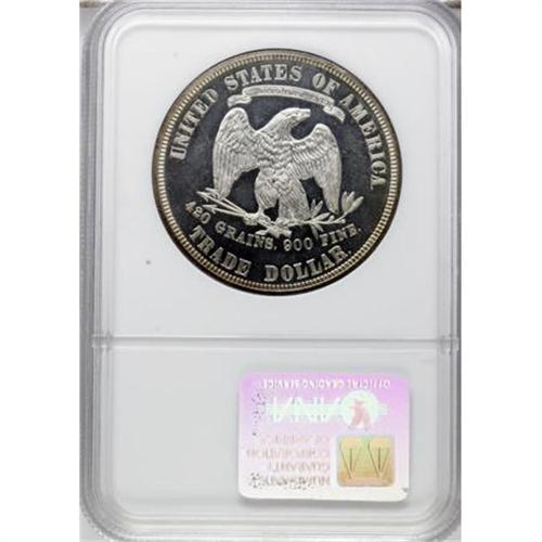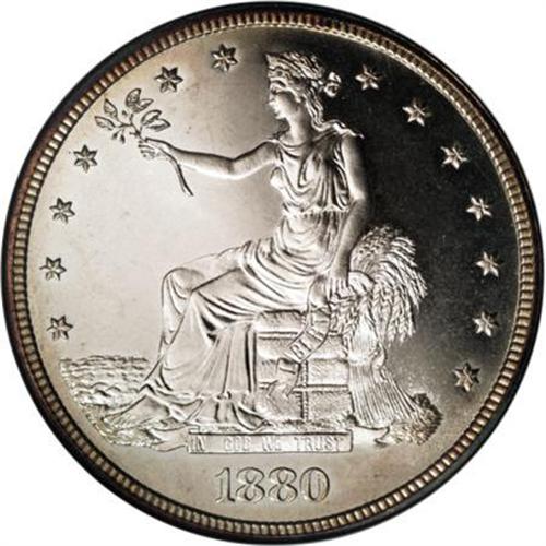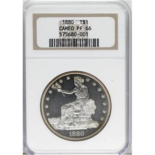 <B>1880 T$1 PR66 Cameo NGC.</B></I> The 1880 Trade dollar was struck in proof finish only, and has the highest mintage of all proofs in the series. In his <I>Silver Dollars and Trade Dollars of the United States</B></I>, David Bowers writes that: "Most ... still exist, perhaps 1,300 to 1,700 of the 1,987 coined." NGC and PCGS have certified several hundred examples, but have assigned the Cameo designation to far fewer specimens.<BR> The Premium Gem Cameo in this lot displays reddish-gold patina at the rims, leaving the central areas completely color free. The field-motif contrast is stunning, and assumes a white-on-black appearance when the coin is observed from an overhead angle. A powerful strike manifests itself in sharp delineation on the design elements, and close scrutiny reveals no significant contact marks. Census: 27 in 66 Cameo, 19 finer (5/07).<BR><I>From The Vanek Collection.</B></I><BR><BR><b>Shipping:</b> Coins & Currency (<a target="_blank" href="http://www.heritageauctions.com/common/shipping.php">view shipping information</a>)