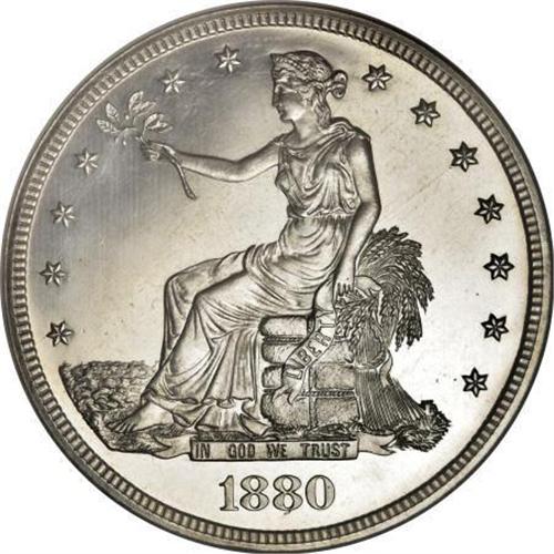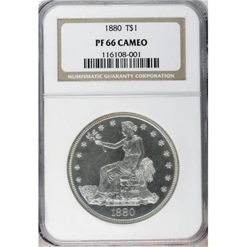 <B>1880 T$1 PR66 Cameo NGC.</B></I> Once production of the Morgan dollars began in Philadelphia, that facility coined trade dollars only in proof. From 1878 through 1883, and also 1884 and 1885, limited production of proof examples took place to supply collectors with coins for their collections. Of course, it would have been a simple matter to discontinue the trade dollar in 1878, but the profit motif kept the series alive for several more years.<BR> This impressive Premium Gem proof has brilliant silver surfaces with lustrous devices that seem to float across the deep mirrored fields. The coin is boldly struck with exceptional details. Census: 28 in 66 Cameo, 19 finer (1/08).<BR><BR><b>Shipping:</b> Coins & Currency (<a target="_blank" href="http://www.heritageauctions.com/common/shipping.php">view shipping information</a>)