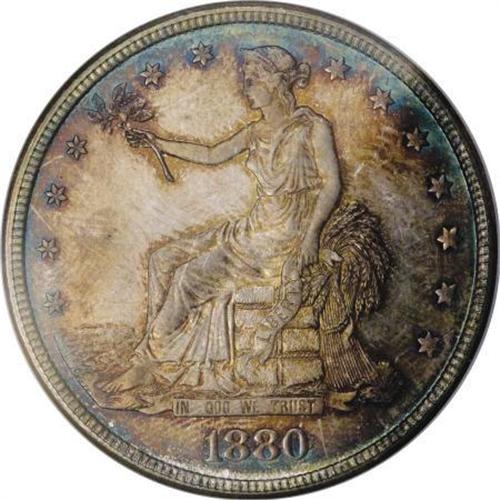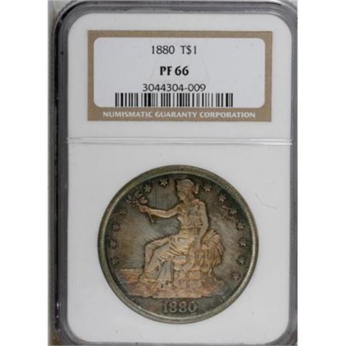<B>1880 T$1 PR66 NGC.</B></I> Exquisite orange and pearl-gray toning drapes the fields and devices, while luminous ice-blue patina graces the peripheries. This unblemished proof-only Premium Gem exhibits outstanding eye appeal. The reverse appears fully struck, and the obverse shows incompleteness only on the curls near the coronet and the centers of the right-side stars. Census: 43 in 66, 18 finer (9/07).<BR><BR><B>Coin Engraver:</B> William Barber<BR><BR><b>Shipping:</b> Coins & Currency (<a target="_blank" href="http://www.heritageauctions.com/common/shipping.php">view shipping information</a>)