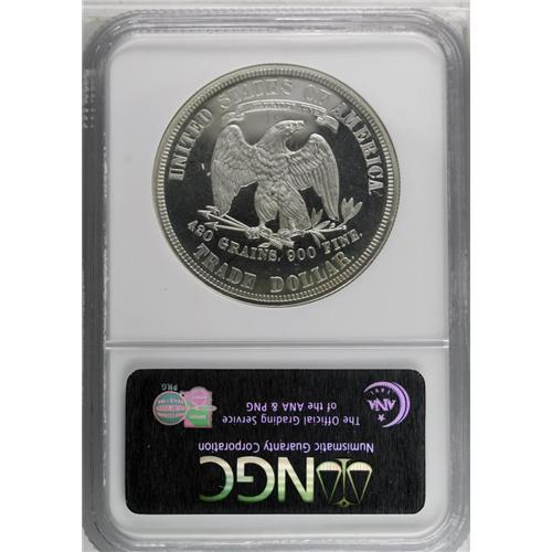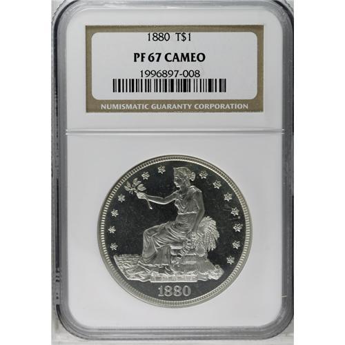 <B>1880<T$1> PR67 Cameo NGC.</B></I> The 1880 Trade dollar is an issue with which we are very familiar. We typically offer at least one example in each of our Signature Sales. Despite our regular offerings of proof 1880 Trade dollars, it is always a special pleasure to offer a Superb Gem. Not only are the surfaces smooth and virtually pristine, but the stark cameo contrast enhances the eye appeal even further. The devices are not only richly frosted, but they are fully struck up over all features. A fully brilliant appearance greets the viewer over each side. This issue is always in demand among specialists, and advanced collectors are sure to line up for the opportunity to bid on this lovely and seemingly immaculate specimen. For future identification purposes, a tiny lintmark is noted above the second T of STATES. Census: 7 in 67, 9 finer (6/06).