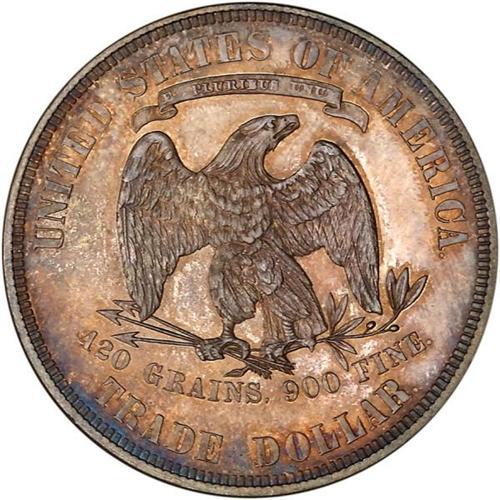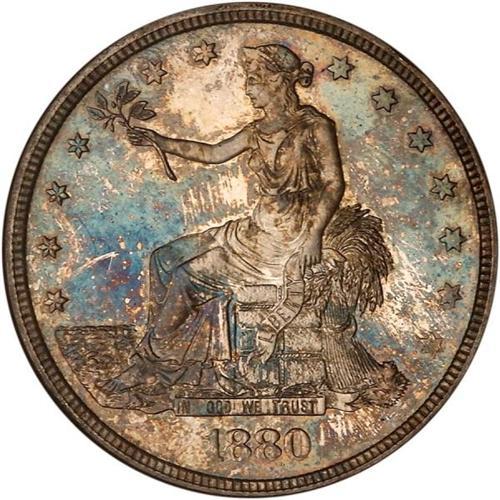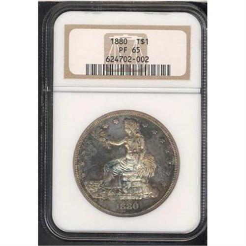 <b>1880 Trade Dollar. NGC graded Proof 65.</b> Look steadily at this Trade dollar and your manner will become quieter with the understanding that it is truly a fresh, original, sparkling and lustrous gem. A satiny frosted beauty with fully defined design features and burst of variable color toning hues on both sides give the coin its likable personality. Part of the Proof-only set of dates from 1878 to 1883 whose low mintage and high appeal keeps collectors champing at the bit whenever a gem specimen like this is offered for sale.