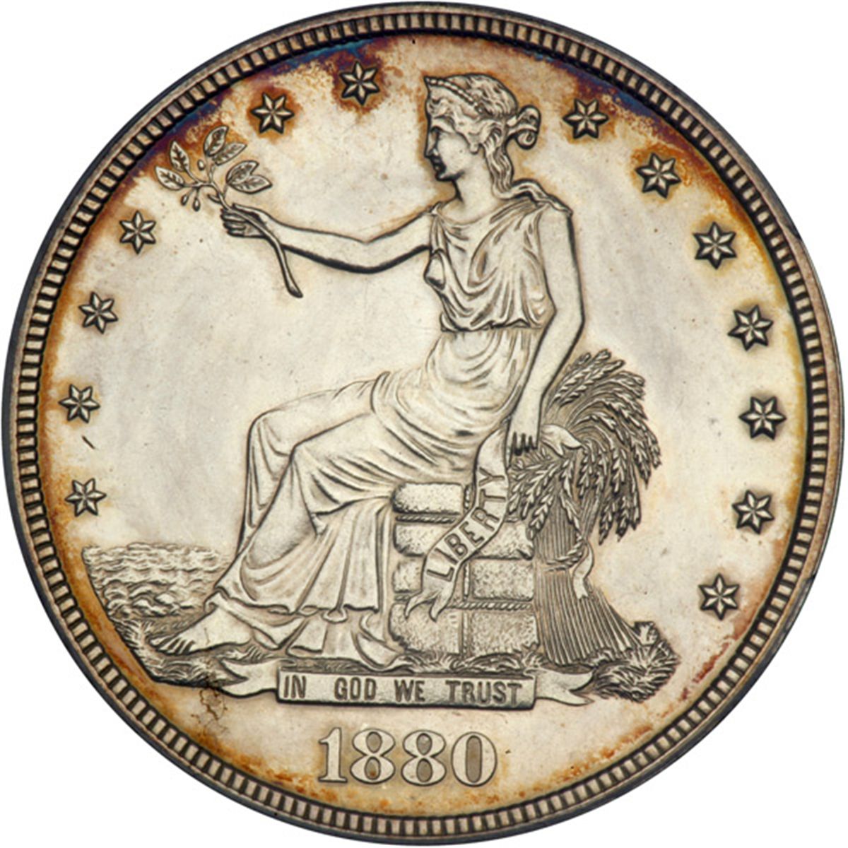 1880 Trade Dollar. PCGS graded Proof 61. Faint hairlines, probably wiped years ago. Mostly brilliant with touches of gold about the borders. A total of 1,987 struck for this proof only year (PCGS # 7060) .