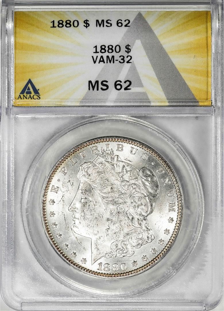 One 1880 VAM-32 $1 Morgan Silver Dollar Coin ANACS MS62. ANACS Certified.