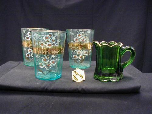1880 VICTORIAN GREEN ART GLASS (3) HND. PTD. BRISTOL TUMBLERS W/GOLD ACCENT 4 in EXCELLENT, (1) FOREST GREEN PANRL 3in CREAM PITCHER W/GOLD EDGE EXCELLENT