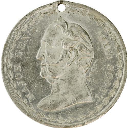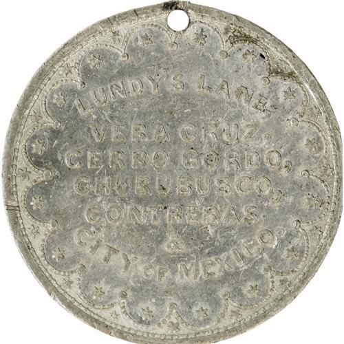 <B>1880 Winfield Scott Campaign Medal in White Metal.</B></I> Listed in Sullivan-Dewitt as WS 1852-6, this token was often muled into various reverses but this example has the intended "original" reverse. The nude bust is encircled with a wreath and the text: "Major Gen: Win: Scott." The reverse has a banner like border, along with the words: "Lundy's Lane, Vera Cruz, Cerro Gordo, Churubusco, Contreras, & City of Mexico." These are battles in which Scott distinguished himself. In almost uncirculated condition; holed; slight soiling on reverse. "Old Fuss and Feathers" would go to lose the 1852 election to Franklin Pierce, however, he still remained active in politics and the military, up to the point of advising Lincoln on tactics to use against the South the in Civil War. Diameter 32mm.