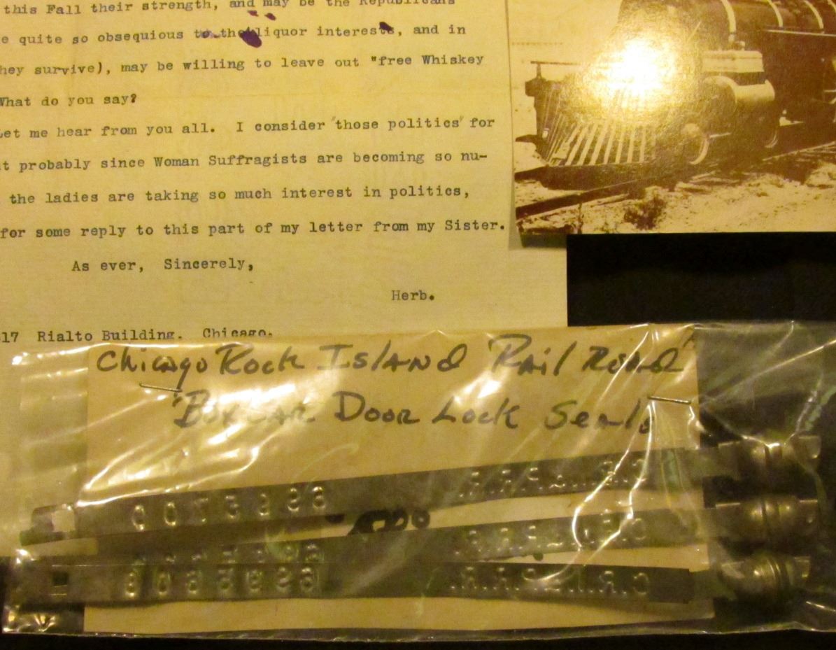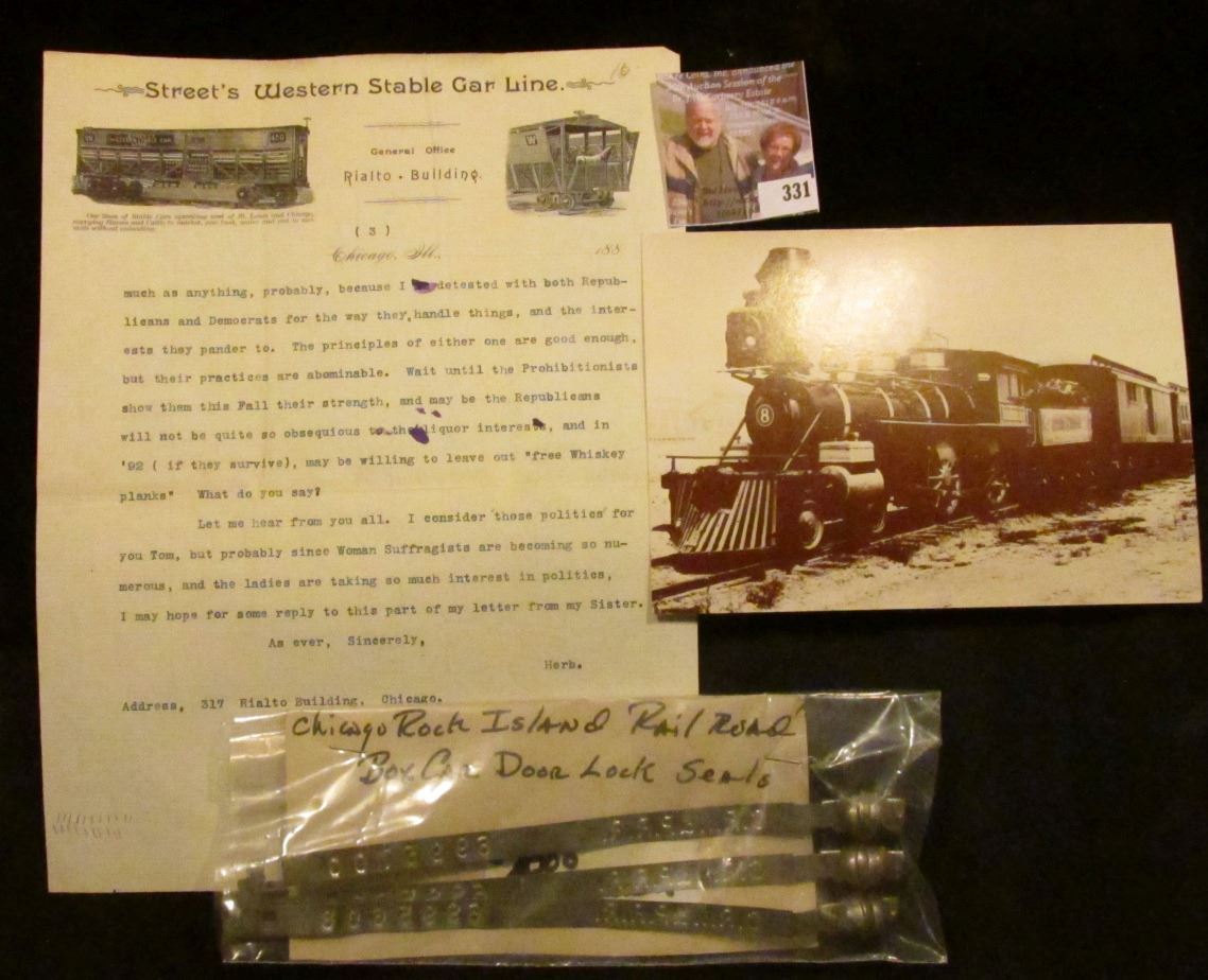1880 era letter on letter head "Street's Western Stable Car Line"; "Early Railroading in Nevada Virginia & Truckee Railroad" Post card; & (3) Chicago Rock Island Railroad Box Car Door Lock Seals" all metal.