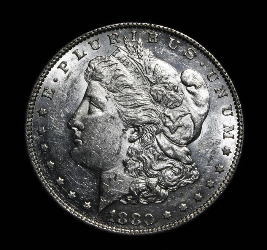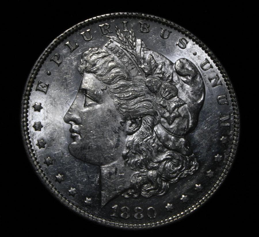 A nice uncirculated example of an 1880-o. Nice strike, good luster. Coin World's Coin Values lists ms62 at $150 The Wholesale Greysheet lists ms60 at $55 and ms63 at $295. Estimated Value $100