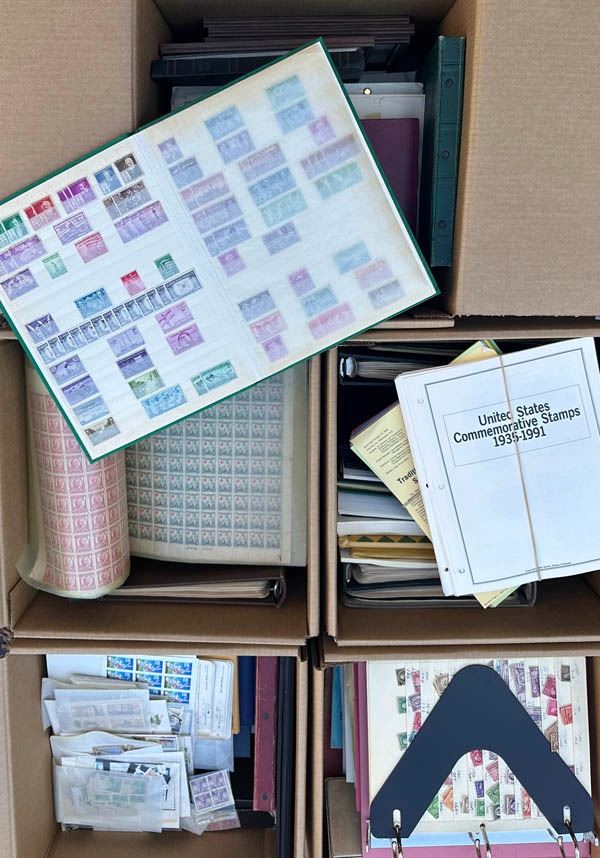 1880's-2000's, a massive accumulation of odds & ends. Housed in 5 large boxes. Noteworthy are:Face value postage, including a nice section in full sheets, with some better values from the early 1930's, plus an ample assortment of plate blocks neatly organized in glassines;Small collections on loose pages, 1930's onward, with some moderately better (mint C1, C3 and the like) and much neatly mounted newer issues;Small collections in older albums, mainly used stamps, with occasional blocks;Stock pages filled with mint and used, some all different, some heavily duplicated, mostly values in the $50 and down catalog value range, but the value does add up because there is a lot of it;Used in small boxes (mostly bundleware);Some more exotic items, including souvenir cards and panels, inauguration covers signed Nancy Reagan, and more.In mixed condition as would be expected, but with enough Fine to Very Fine to make this an interesting and very worthwhile lot. Inspection will definitely help to appreciate fully. Shipping weight 155 lbs / 70.5 kilos