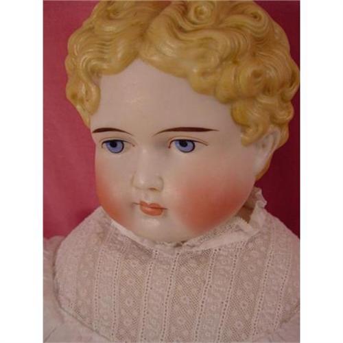 1880's Alt, Beck & Gottschalck, Bisque Shoulderhead, 29in Beauty, Excellent. She has no hairlines, damages, or repairs on the bisque. Molded blonde hair, closed mouth with cloth body and bisque arms all in good condition. She has one stroke eyebrows and painted blue eyes. She wears a gorgeous long white antique christening gown, underskirt with beautiful embroidery and matching pantaloons.This is a very large doll and most definitely to become a heirloom in a doll collection.