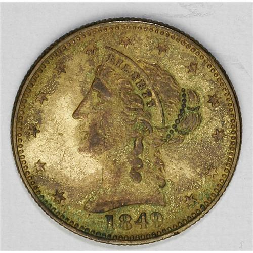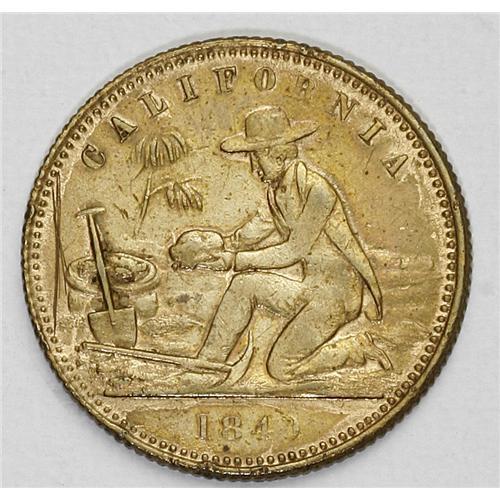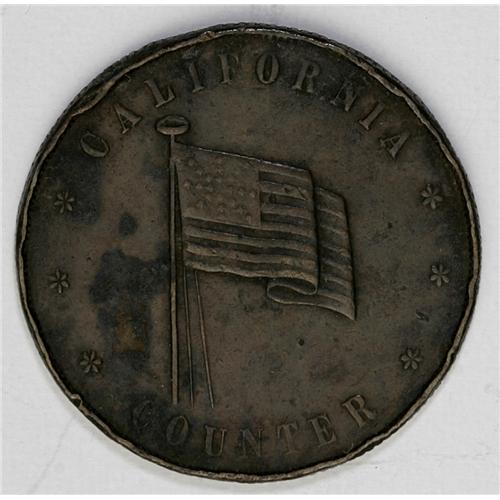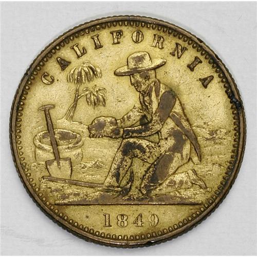 <B>(1880's) California Gaming Counters Group Lot.</B></I> Includes: two imitation five dollar size tokens with a miner on the reverse and the date 1849 below; and an imitation of a U.S. twenty dollar gold with a flag on the obverse and a eagle on the reverse. This popular group will draw attention from California token collectors.