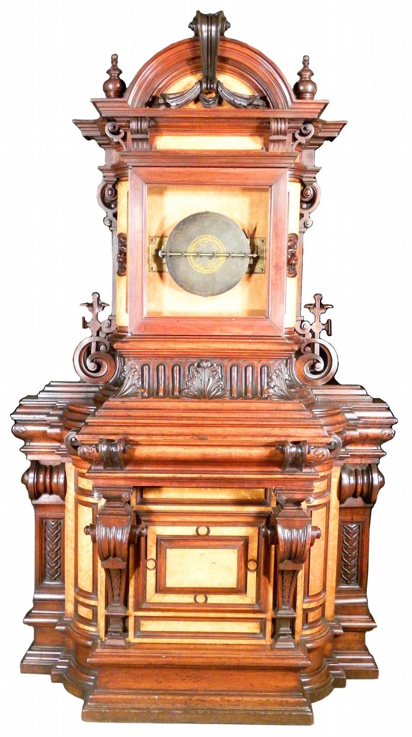 1880's Daniel Pabst Symphonium. Exquisite Cabinet of Walnut and Birds Eye Maple Wood. Marked with Daniel Pabst initials in 3 places. One of only 3 known pieces made by Pabst that is signed. Excellent Working Condition. A Virtuoso cabinetmaker of the Victorian Era, Daniel Pabst (1826) - 1910) created some of the most extraordinary hand-carvved furniture in America. Pabst crafted pieces in the Neo-Grec, Renaissance Revival, Modern Gothic and Colonial Revival styles. Examples of his work are in the collections of the Metropolian Museum of Art, the Philadelphia Museum of Art, the Art Institute of Chicago and the Victoria and Albert Museum in Great Britain. Born in Langenstein, Germany, Pabst immigrated to the U.S. in 1849 and settled in Philadelphia where he would spend his professional career. The excellence of his craftsmanship elevated him above his peers, as did the strongly architectonic (building-like) quality of his furniture designs. He was a master at cameo-carving (intaglio) in wood: veneering a light-colored wood over a darker, then carving through to create a vivid contrast. Of the presumably thousands of pieces produced over half a century, only 3 are signed and this is one of them. Pabst retired in 1896 but continued making furniture for friends and family members into his eighties. 47 X 78 X 18 Inches.