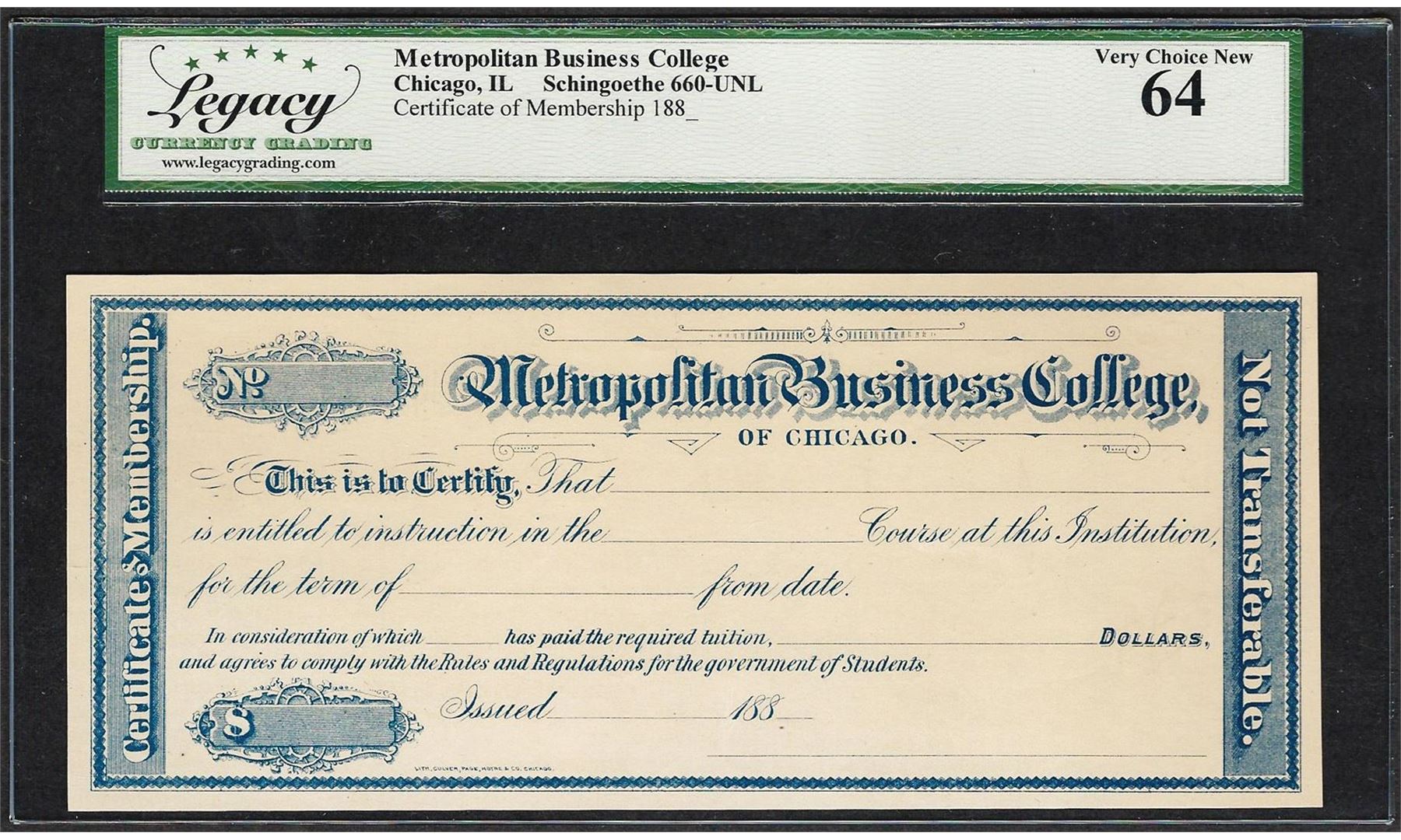 One 1880's Metropolitan Business College Chicago, IL Obsolete Check Legacy Very Choice New 64. Legacy Graded.