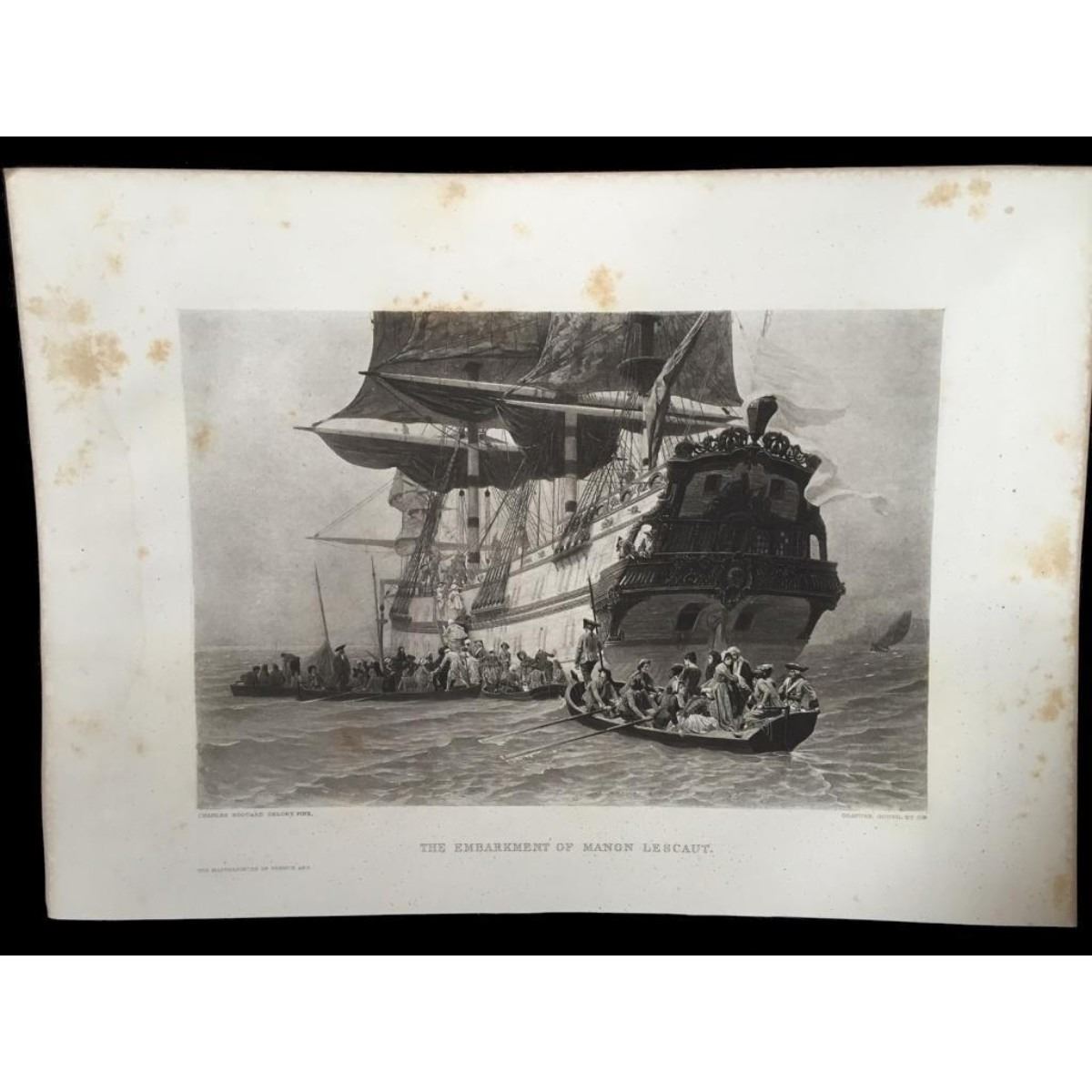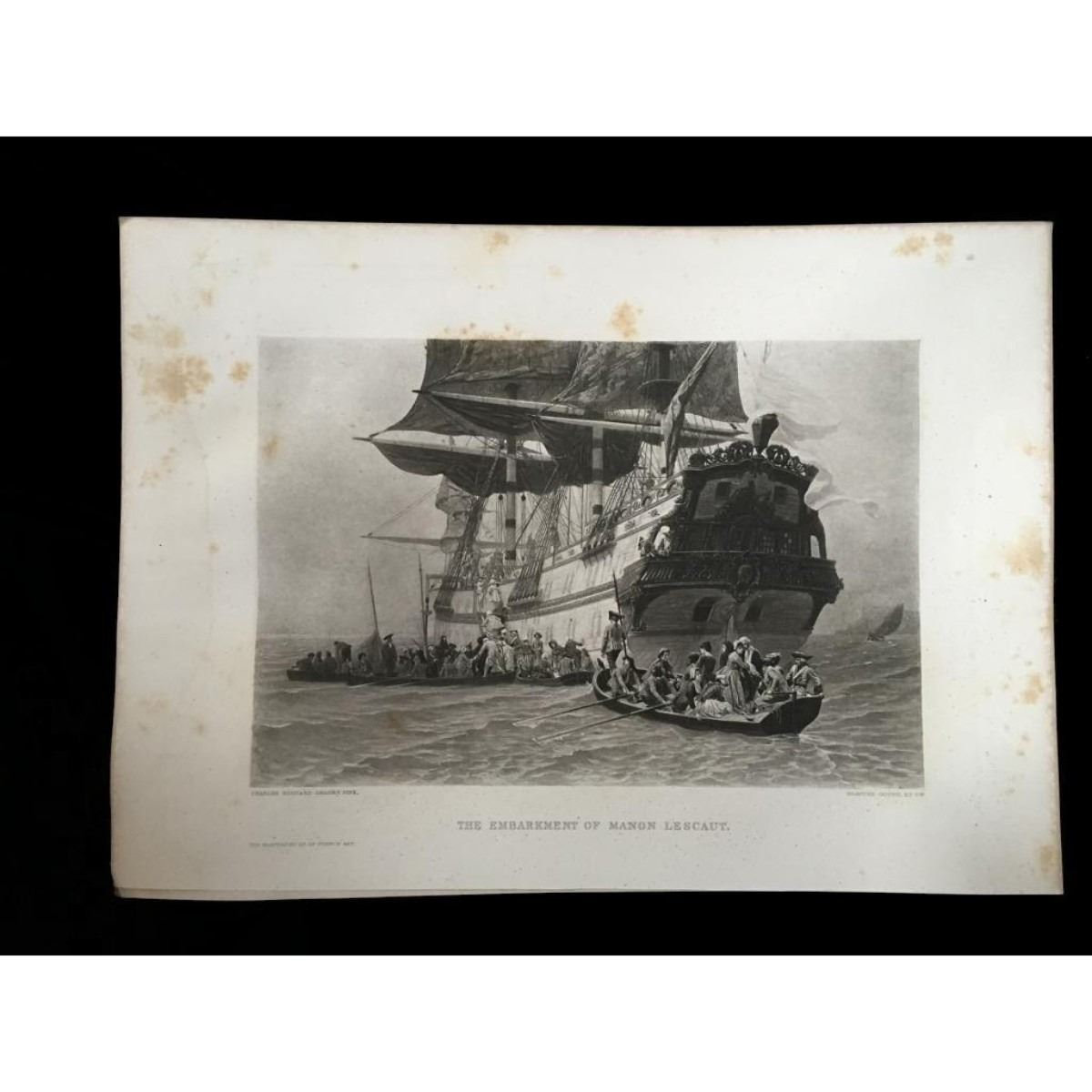 Original 1883 photogravure print, from a limited, imperial edition of 1000, "The Masterpieces In French Art" by Goupil & Co. engravers, Paris. Printed on japon paper. From an 1875 painting by Charles EdouardDelort. The scene -The tragic romance of Manon Lescaut, shows a small boat with the lovers about to board a transport sailing ship. 10" X 14" with scattered foxing from age. Includes a descriptive page about theartist & scene.
