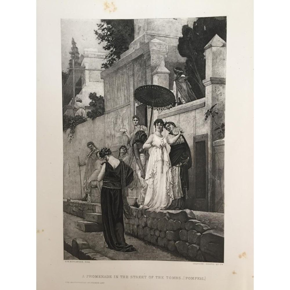 Original 1883 Photogravure from the original painting by G. R. Boulanger, "A Promenade In The Street Of The Tombs. ( Pompeii )." From an imperial limited edition of 1000 "The Masterpieces of French Art." The scenedepicts fine ladies in ancient Pompeii, standing on the edge of the street, looking, with envious stares, at another lady walking by. Goupil & Co. engravers, Paris. On Japon paper. 9" X 11 1/2" image size for framing.Light foxing & print has been trimmed on the top & bottom to accommodate a mat. Comes with original description page.