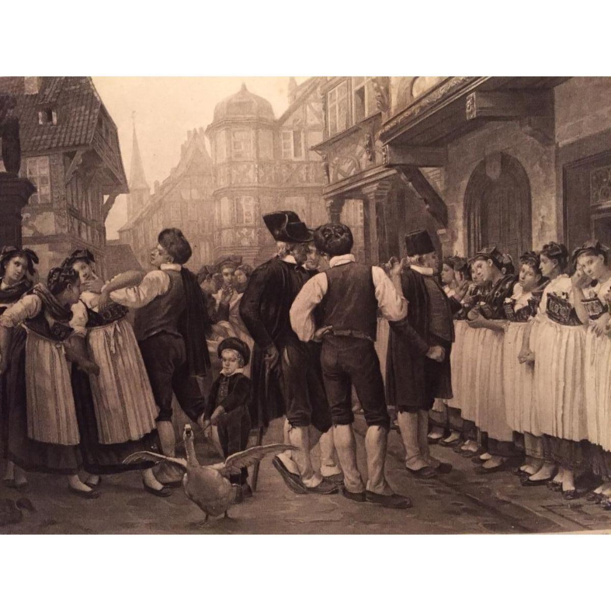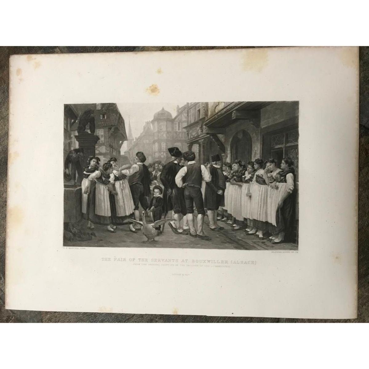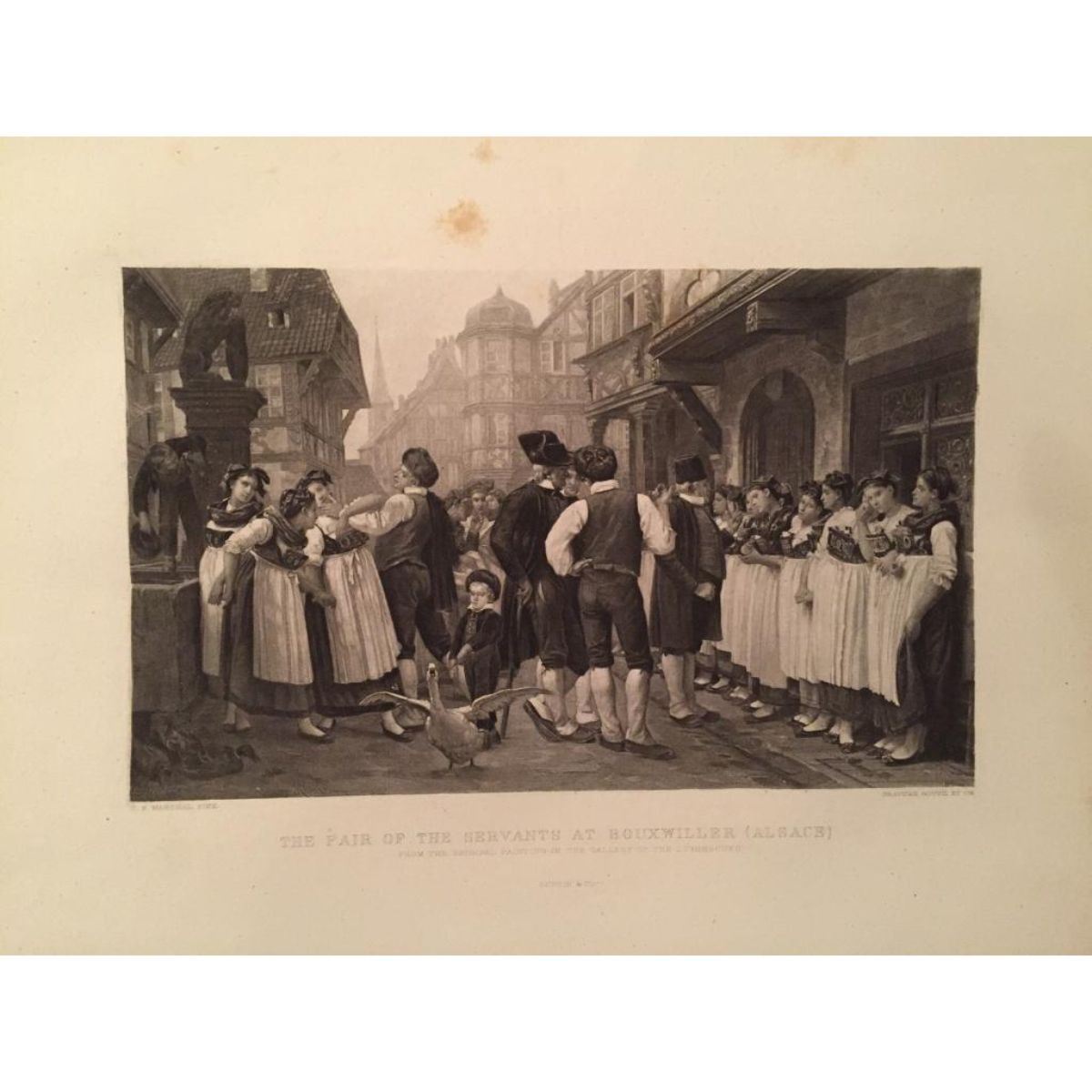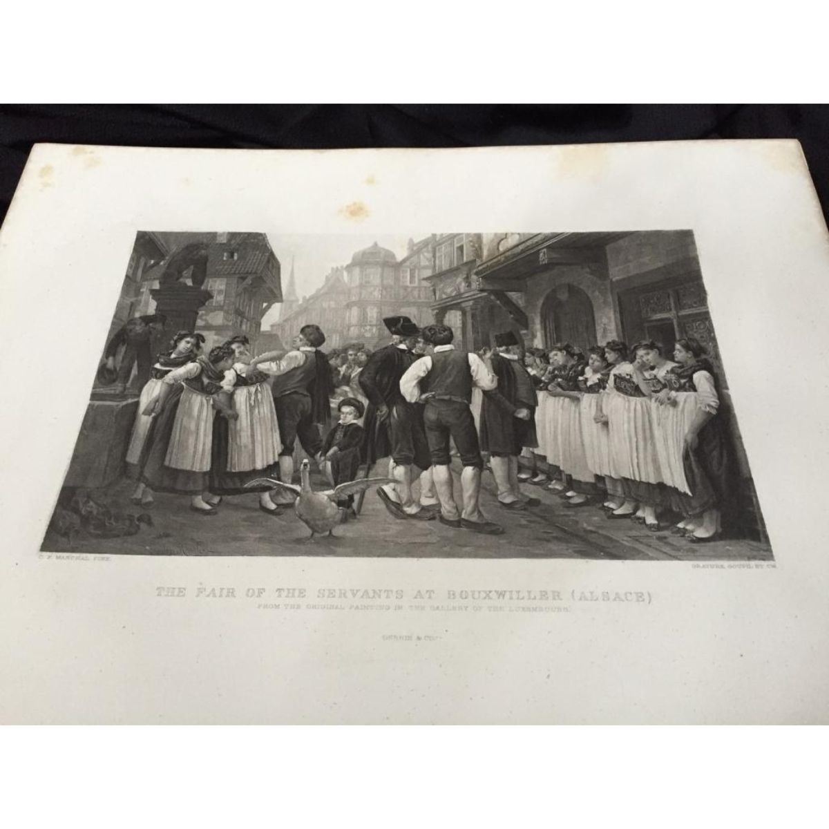 Original 1883 photogravure from an 1870's painting by C.F. Marchal, in the Gallery of Luxembourg. Goupil et Cie, Paris engravers. Printed on Japon paper. " The Fair Of The Servants At Bouxwiller ( Alsace ). The scene, a "hiring" or "feeing" fair taking place in France. Well dressed domestics are lined up for inspection by potential employers. A gorgeous print with very little foxing seen on the outside areas that does not interfere with the image. From an 1880's edition of "The Masterpieces Of French Art." Comes with the original divider/ description page with information on the scene. Approx 10" X 14".