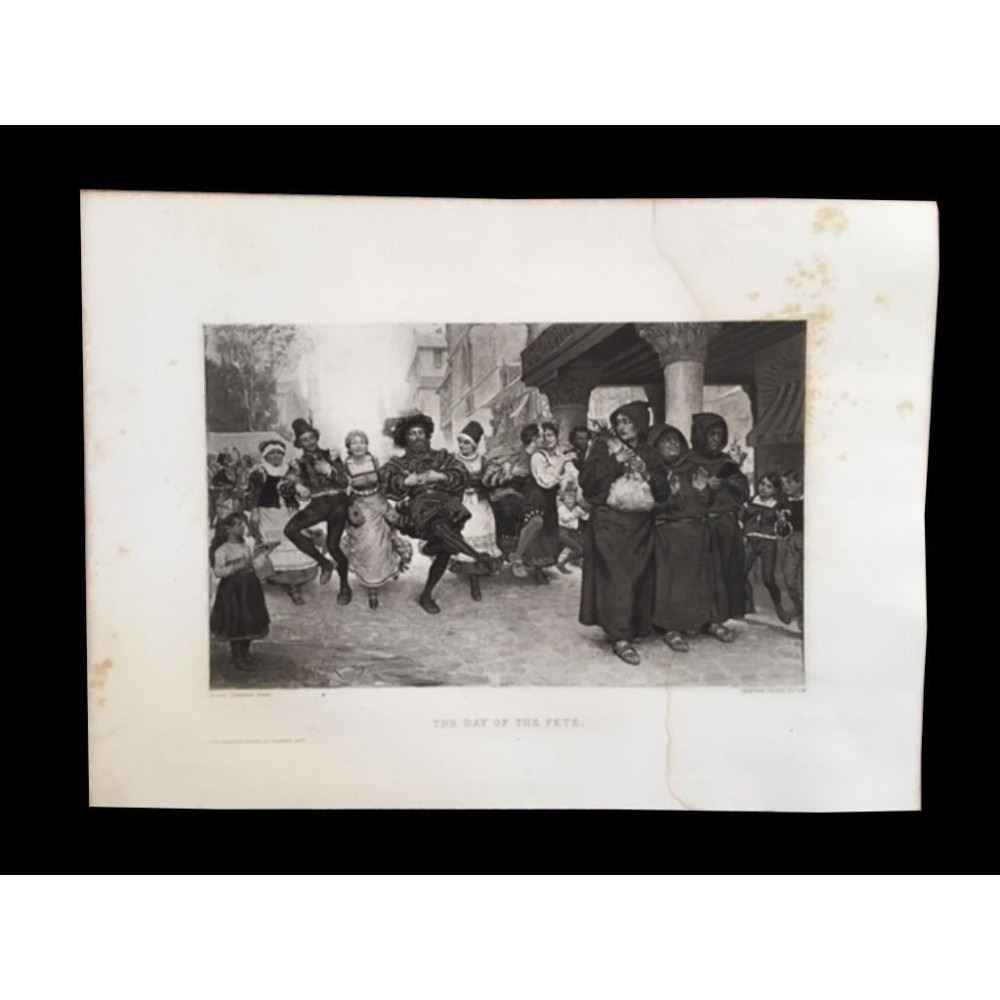 Original 1883 Photogravure Print on Japon paper, from "The Masterpieces of French Art". Taken from the original 1879 painting by Jules Garner. Goupil & Co engravers, Paris. The scene is in Flanders at the height of the Carnival. People are singing & dancing in the street while & group of monks walk in front. The youngest looking back as if wanting to join in, the middle monk "on the fence" and the one on the far left isreciting his prayers. Approx 9" X 13" image size. * Scattered foxing with an older water stain to the right hand side that runs the length of the print but tends to fade into the dark ink in the scene. Descriptive coverpage about the print is included.