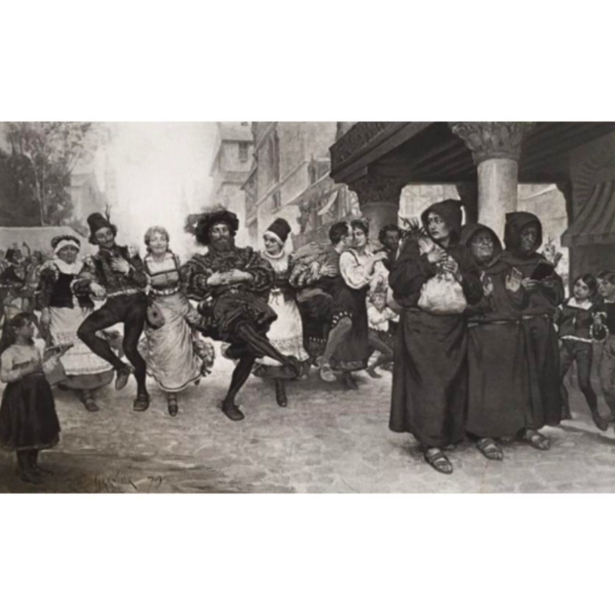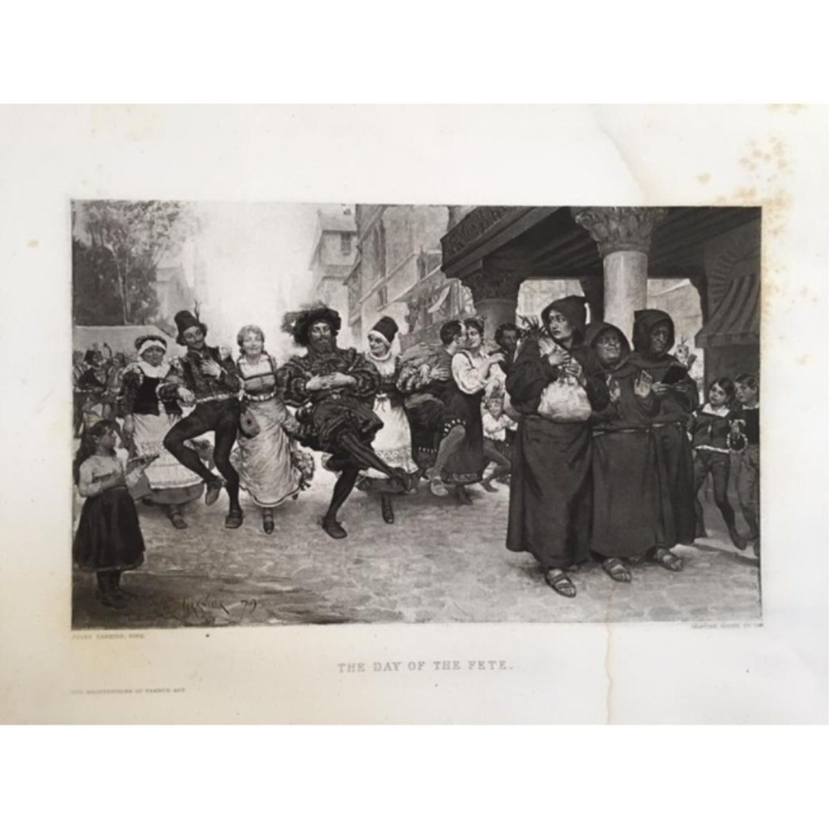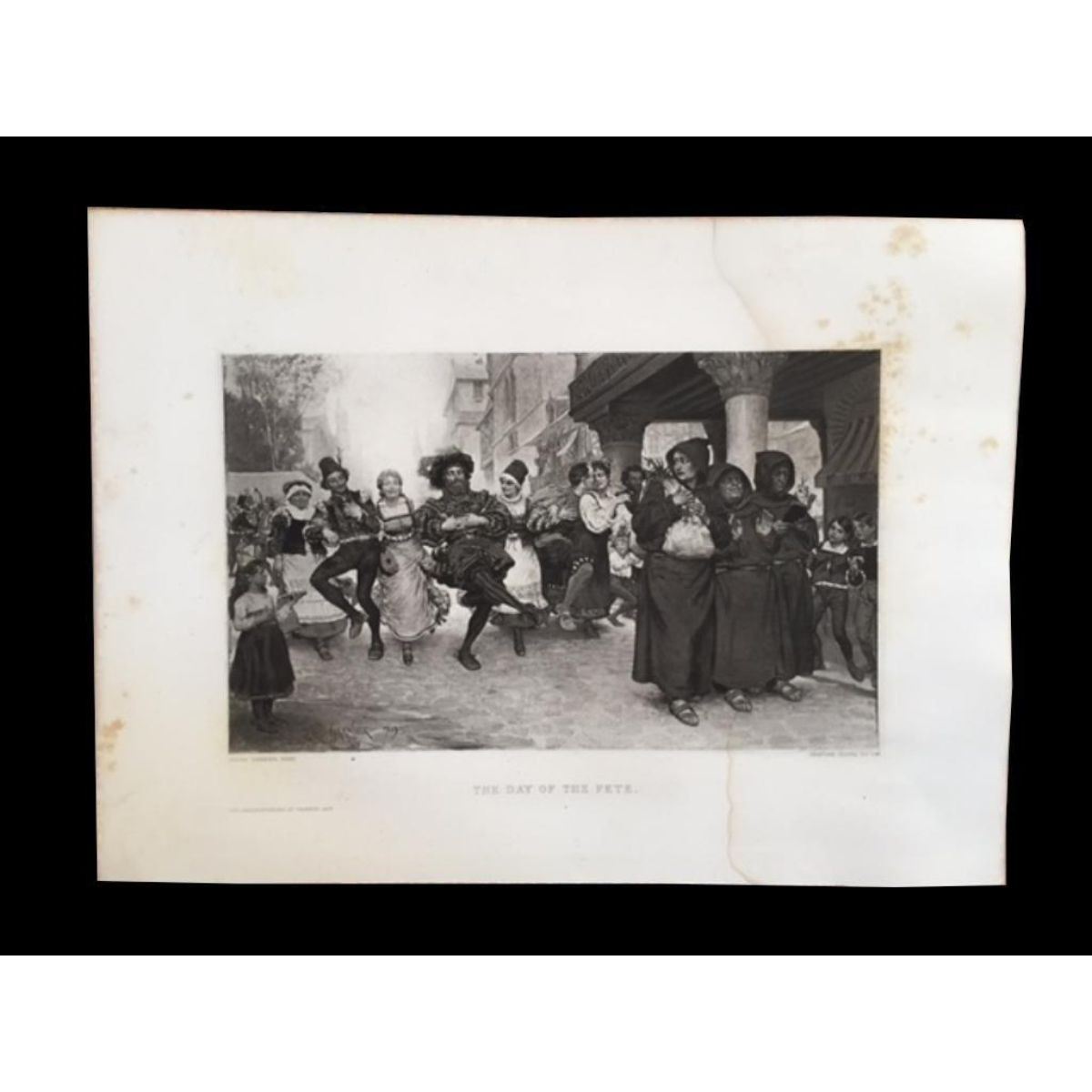 Original 1883 Photogravure Print on Japon paper, from "The Masterpieces of French Art". Taken from the original 1879 painting by Jules Garner. Goupil & Co engravers, Paris. The scene is in Flanders at the height of the Carnival. People are singing & dancing in the street while & group of monks walk in front. The youngest looking back as if wanting to join in, the middle monk "on the fence" and the one on the far left is reciting his prayers. Approx 9" X 13" image size. * Scattered foxing with an older water stain to the right-hand side that runs the length of the print but tends to fade into the dark ink in the scene. Descriptive coverpage about the print is included.