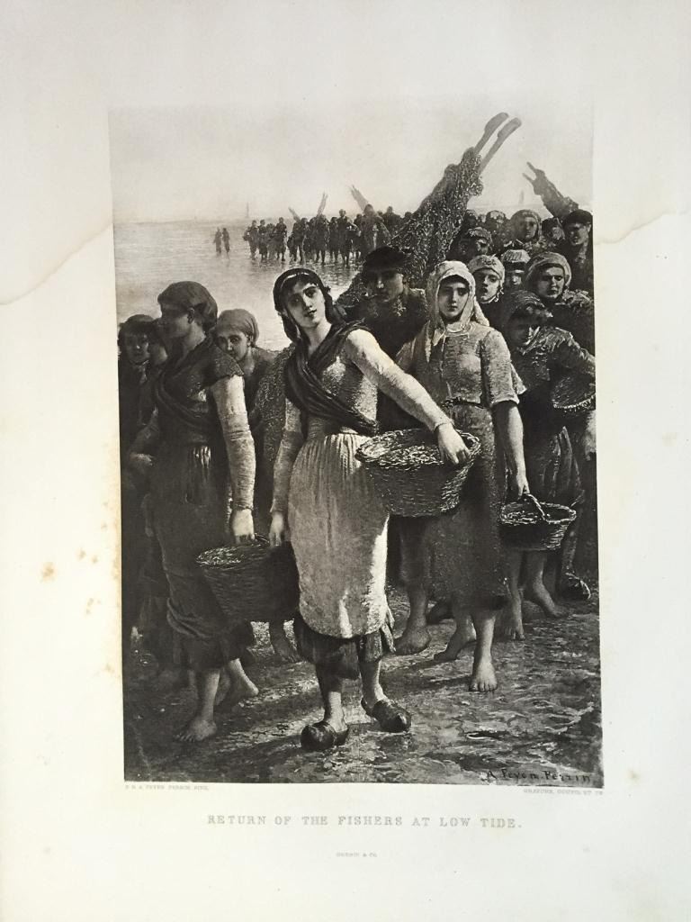 Original 1883 Photogravure on Japon paper, from the original 1880 painting by Francois-Nicholas-Augustin Feyen-Perrin. From a limited, imperial edition of 1000, "The Masterpieces of French Art". Goupil & Cieengravers, Paris. The scene - Fishers, mostly women, returning with their baskets of fresh catch. 10" X 14". Comes with the original divider page giving a description of the print. Light foxing, sprinkled around theouter edge & an older, but very light, water stain to the top 1/4th of the print.