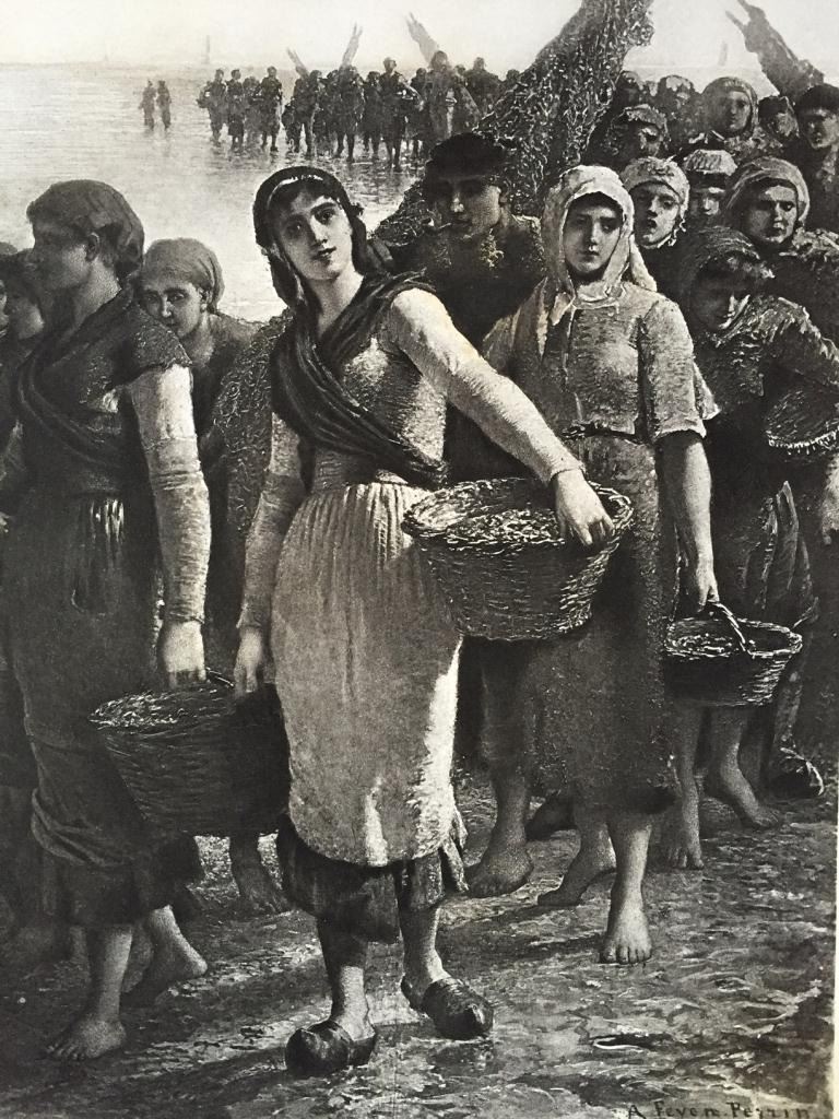 Original 1883 Photogravure on Japon paper, from the original 1880 painting by Francois-Nicholas-Augustin Feyen-Perrin. From a limited, imperial edition of 1000, "The Masterpieces of French Art". Goupil & Cieengravers, Paris. The scene - Fishers, mostly women, returning with their baskets of fresh catch. 10" X 14". Comes with the original divider page giving a description of the print. Light foxing, sprinkled around theouter edge & an older, but very light, water stain to the top 1/4th of the print.
