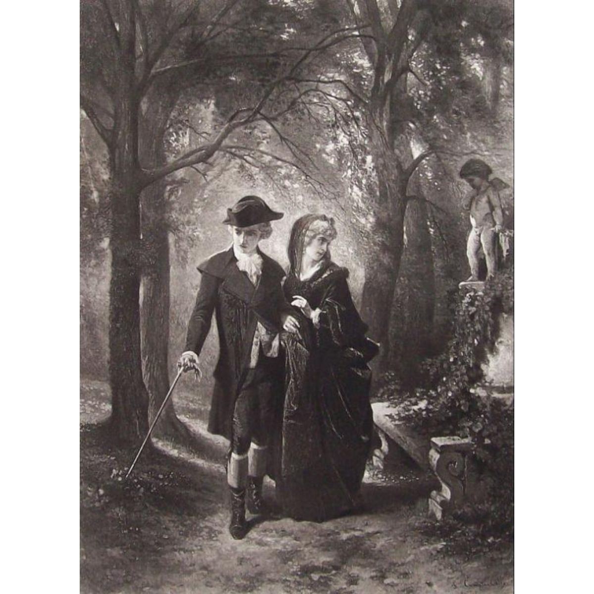 Original 1880's photogravure print from the original painting by F.C. Compte - Calix. From an Imperial limited editon of 1000, the Masterpieces of French Art. Engraved by Goupil & Co, Paris on heavy Japon paper. "Poor Love". Courtship scene. Comes with original descriptive divider page. 11" X 14".
