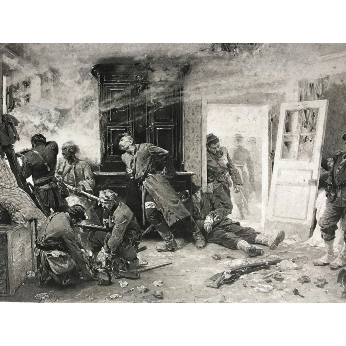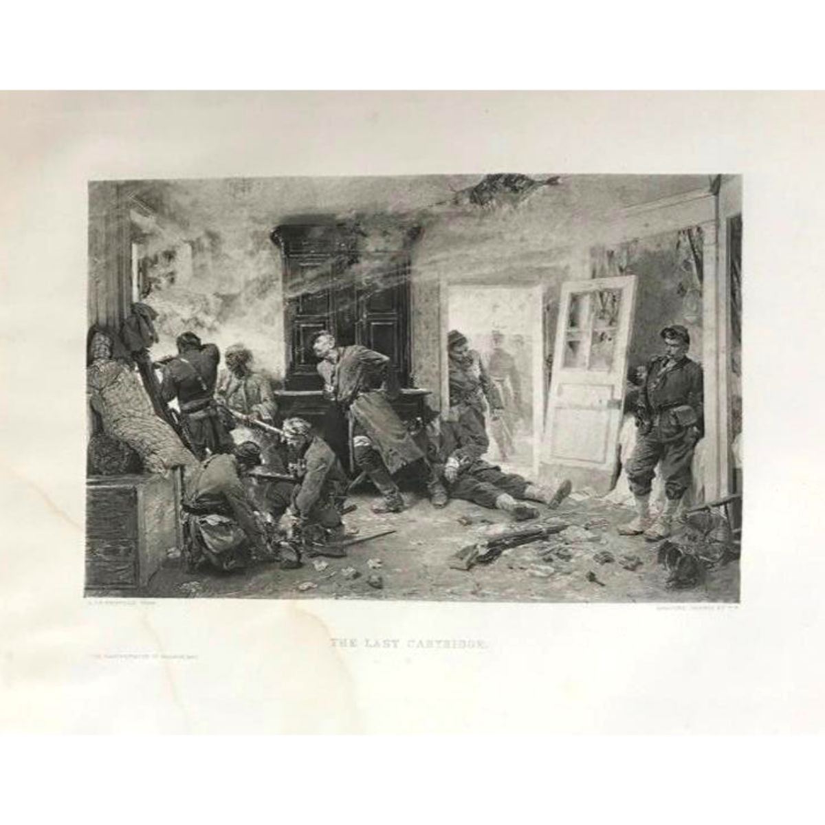 1880's photogravure print, from Masterpieces of French Art, Goupil & Co gravure, from the original painting by De Neuville, Last Cartouche. Depicts an incident of bravery in the late Franco Prussian war. 11" X 14 1/2" on heavy Japon paper. Comes with descriptive divider page. * staining to left bottom, as seen in photos & some foxing from age.Â