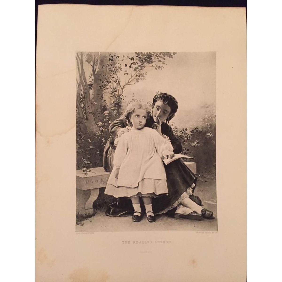 Original 1883 photogravure print entitled, The Reading Lesson. From the original painting by Leon Perrault. From an imperial limited edition of 1000, The Masterpieces Of French Art, on heavy Japon paper. Goupil & Co engravers, Paris. 9" X 12" image area. * light foxing around borders & a water stain to the top left portion of the print, as seen in photos. Original descriptive divider page included.