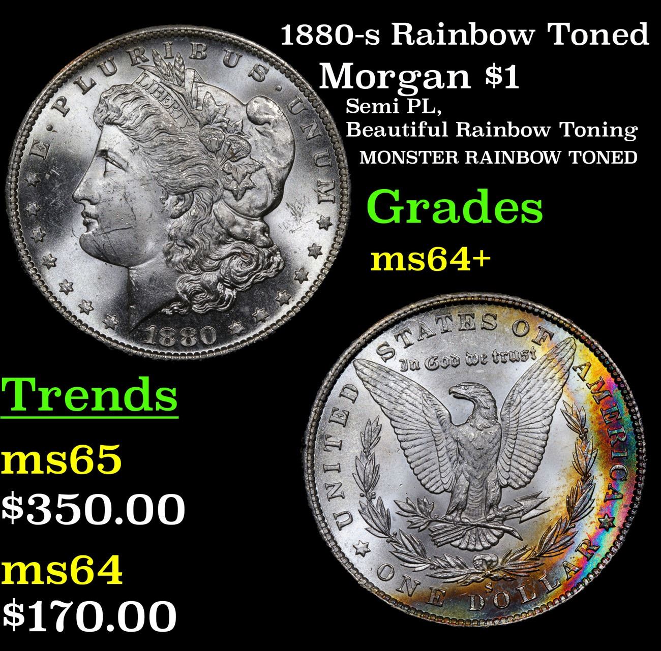 1880-s Rainbow Toned Semi PL, Beautiful Rainbow Toning MONSTER RAINBOW TONED Morgan Dollar $1 Grades Choice+ Unc. A Corey's Pick, Bid to Win Coin