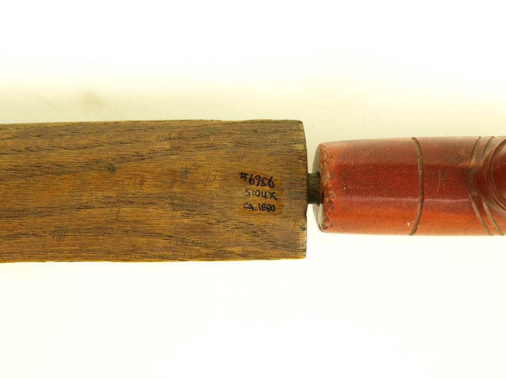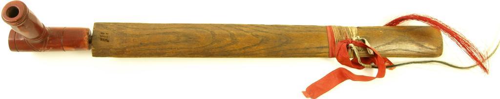 ash stem catlinite T bowl, red ribbon cloth decorated stem, hair drops showing old museum inventory number, 20 1/2" overall.