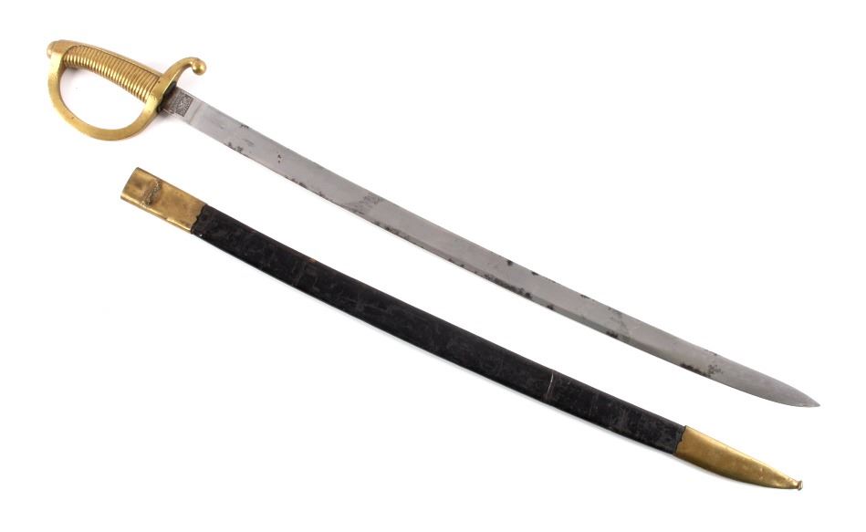 This is a Spanish artillery short sword from circa 1880. The sword features a hardened steel blade that is marked on the ricasso "Artilleria Fabrica De Toledo". The handle is made from solid brass. The scabbard is made from leather with a brass locket and chape. The Spanish artillery sword is in good condition. It measures 33" long.