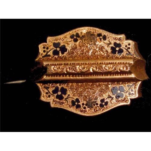 This is a mid 1800's 9kt gold and enamel brooch with the hook for chatelaine chains or a watch or locket. This is 1 1/2" long and 1 1/4" wide. The center is a raised column that really adds character to this lovely piece. The front has two small spots ( see photos) that are not perfect. HInge and clasp work fine.