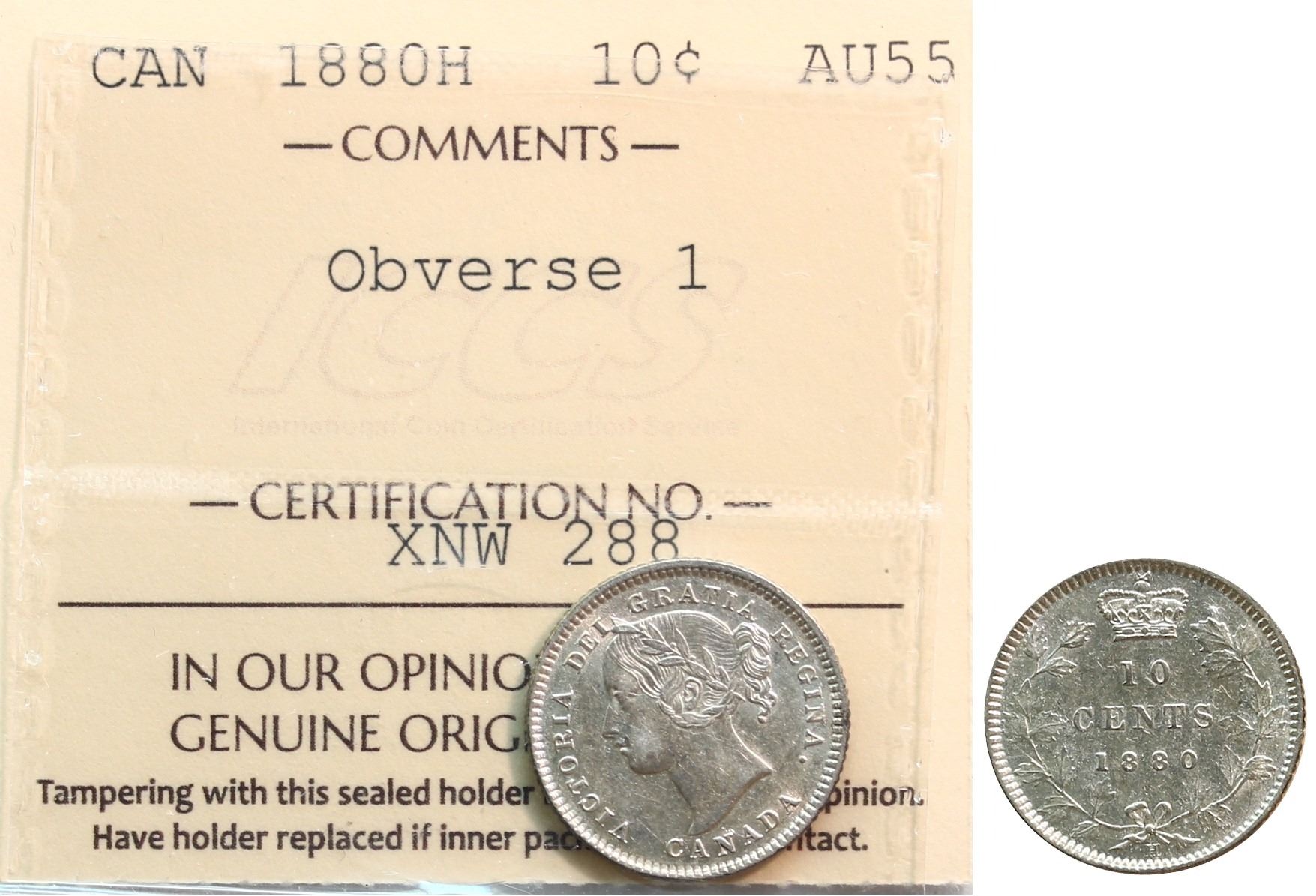 1880H 10¢ "Obv 1" ICCS Choice About Uncirculated-55