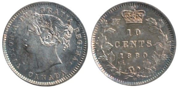 1880H 10¢ Obv 1 ICCS MS64. Lustrous with touch of bluish tint.